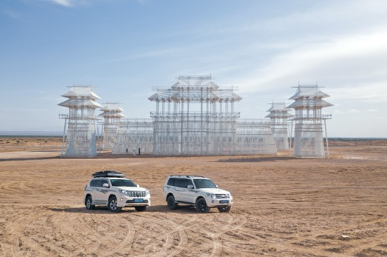 除了红砂岩婴儿以外,驱车行驶在戈壁上,荒芜中一座纯净简洁的白色之城映入眼睑会让人以为是幻觉。但当你走近,白色的钢管在褐色的大漠与湛蓝的天空中肆意组合。虽然触手可及,也会觉得是一座天上的宫阙投影于此,也许这就是艺术之于空间的创造力,让我们心生敬畏。团队一行在瓜洲无届集合出发也是一个十分不错的开端。