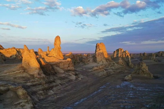 黄金海子的素材拍摄完毕后时间已将至黄昏,我们要提前准备驱车开回营地,夕阳西下阳光散在黄色的雅丹上,满眼的金灿灿在我眼里绽放,此刻太过享受,言语无法描述。